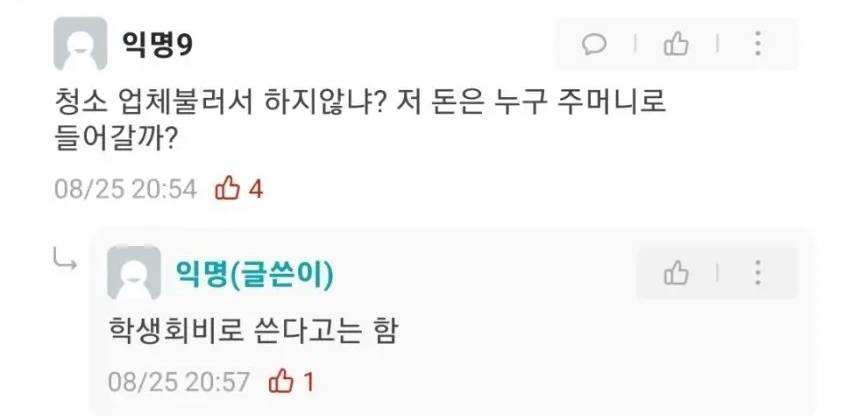 미리 공지한대로, 8/31(수) 14:00에 예정된 강의실 대청소에 못 오시는 분들은 부참비를 내주셔야 합니다.