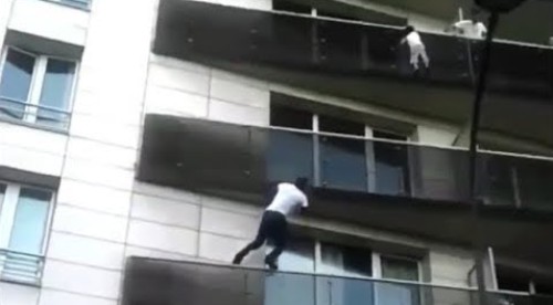 이때 한 청년이 뛰어나와 맨손으로 각 층의 발코니를 잡고 거침없이 아이를 향해 올라갔다.