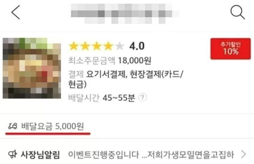 글쓴이는 최수 주문금액이 1만 8천원인 한 식당에서 배달 요금을 5천 원으로 책정했다며 강하게 비판했다.