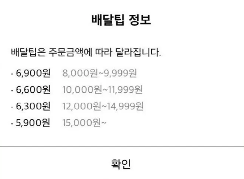 주문 금액에 따라 배달료가 다르게 책정되는 곳도 있었는데 8천 원 이상이면 6,900원, 1만 원 이상이면 6,600원이 책정된다.