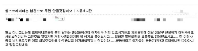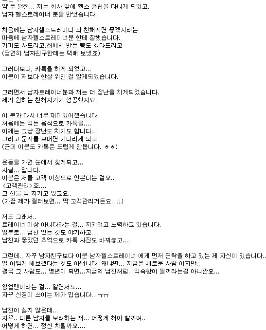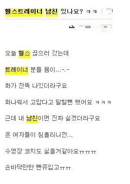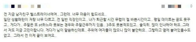 그래서 그런 헬스트레이너들을 남친으로 둔 여성들의 고민과 남자 헬스 트레이너에게 PT 수업 등을 받고 있는 여성들의 사심 섞인 푸념을 밑에 사진 첨부하니 참고하면 될 듯 하다.