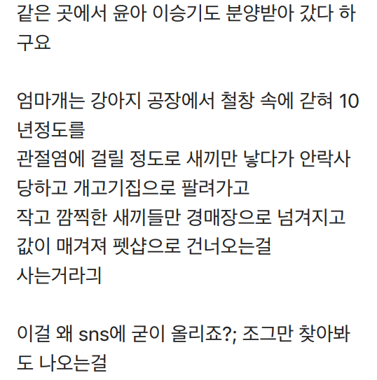 게다가 개가 유기된 후 구조되기 전에 개장수가 잡아가는 경우도 많고, 혹은 구조되기 전에 굶어 죽는 경우도 있다.
