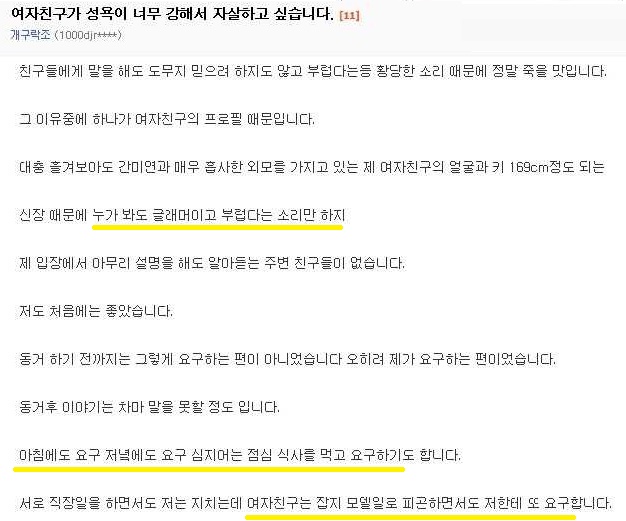 해당 게시글을 올린 작성자 A씨는 “여자친구 성욕이 너무 강해서 자살하고 싶습니다”라는 제목의 글로 많은 이들의 관심을 끌었다.