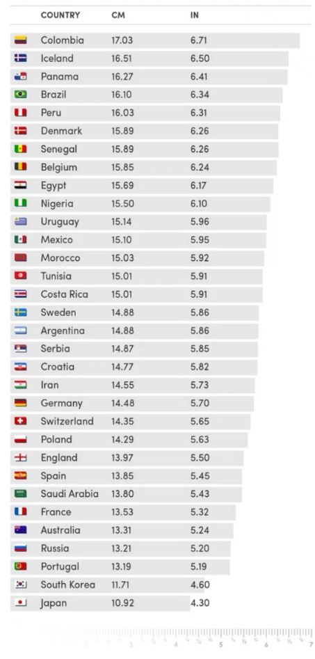 또 러시아 월드컵에 참가한 32개국 남성들의 성기 길이를 순위별로 정리한 자료에 따르면 1위는 콜롬비아로 평균 사이즈가 17cm에 달했다. 이어 2위는 아이슬란드 16.51cm , 3위는 파나마 16.27cm 되었다.