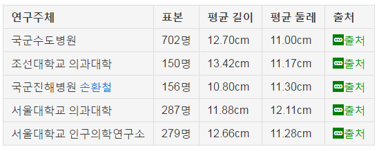 해당 자료를 봐보면 대한민국 남성의 발기 후 평균 길이는 12~13cm , 둘레는 11cm 인것으로 알려졌다.