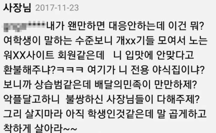 충격적인 후기를 본 사장은 화났는지 사장님은 “내가 웬만하면 대응 안하는데 이건 뭐? 여학생이 말하는 수준 보니 XXX들 모여서 노는 워XX 사이트 회원같다”며 “너 입맛에 안 맞다고 환불해주냐? 여기가 네 전용 야식집이야?”라고 댓글을 남겼다.