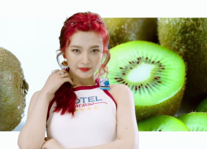 빨간 머리를 한 조이와 잘 어울렸던 이 수영복은 많은 팬들이 정보를 찾아 헤매게 만들었던 의상이다.