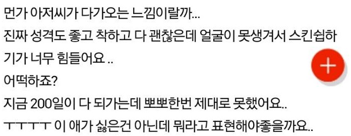 끝으로 A 씨는 “지금 200일이 다 돼가는데 뽀뽀 한 번 제대로 못했어요.. 이 애가 싫은 건 아닌데 뭐라고 표현해야 좋을까요..”라 말하면서 네티즌들에게 자문을 구했다.