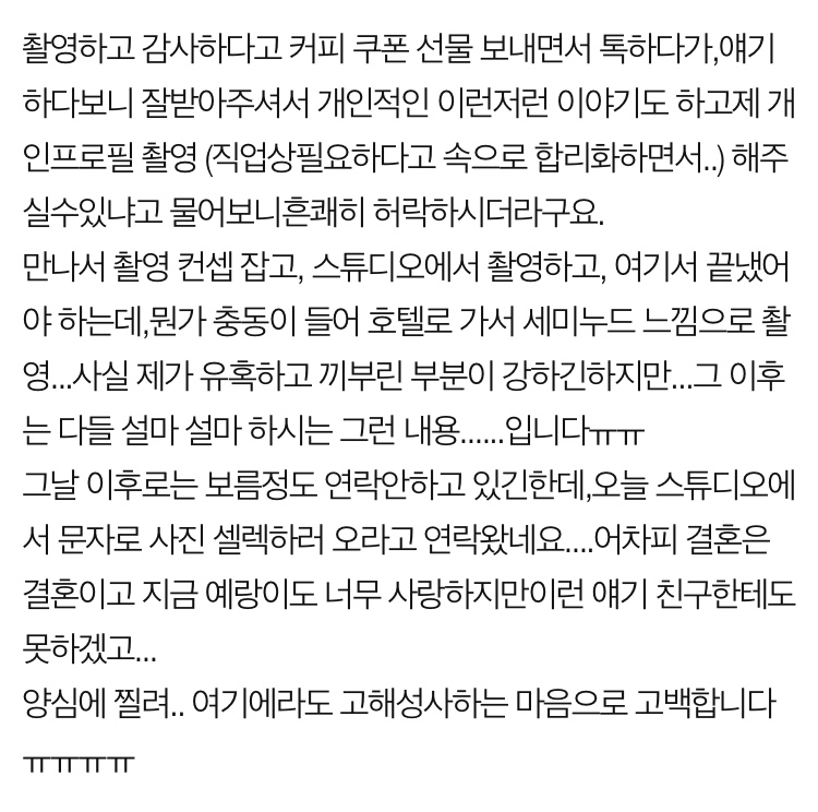 그날 이후로는 연락을 안 한지 보름 정도 됐다는 글쓴이는 “오늘 스튜디오에서 사진 셀렉하러 오라고 연락왔다”며 양심에 찔려 고해성사하는 마음으로 글을 썼다고 밝혔다.