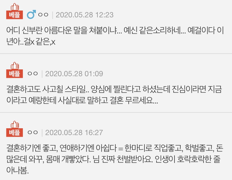 이에 누리꾼들은 “예랑한테 사실대로 말하고 결혼 무르세요”, “님 진짜 천벌 받아요”, “신랑이 불쌍하다” 등의 반응을 보였다.
