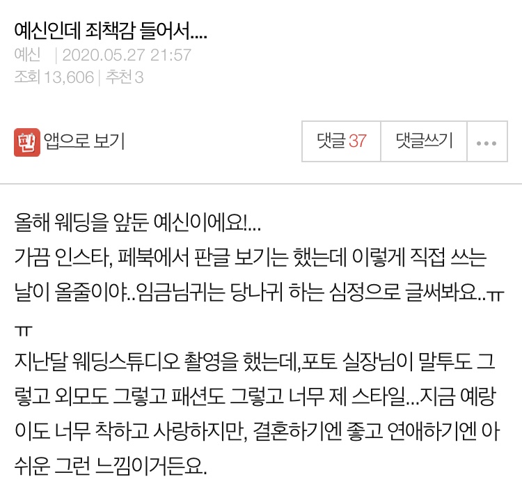 최근 한 온라인 커뮤니티에 결혼을 앞둔 예비신부가 ‘죄책감이 든다’는 글을 올려 주목을 끌었다.