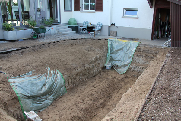 실제 노천탕이 될 사각형은 물론이고 주변도 파서 식물과 자갈을 둘 공간을 만든다.