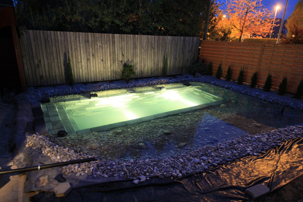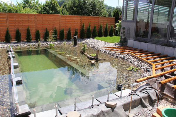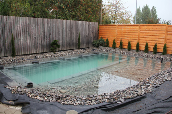 평소엔 물을 수영장 안쪽에만 채우며, 비가 와서 넘치면 미리 파둔 자갈 부분까지 물이 넘치는 시스템이다.