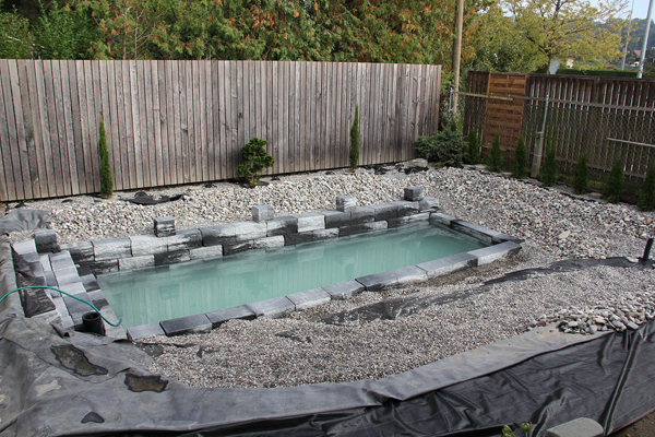 그 다음 노천탕 자리에 장식용 석재를 깔고 주위에 자갈을 놓아 인테리어를 완성한다.