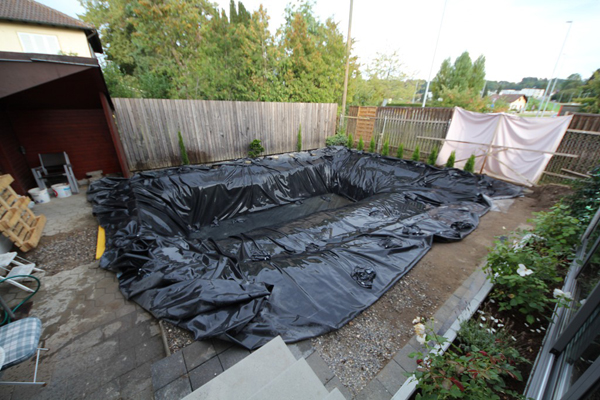 구덩이 안으로 물이 새어 들어가면 안되기 때문에 펠트와 비닐을 덮어준다.