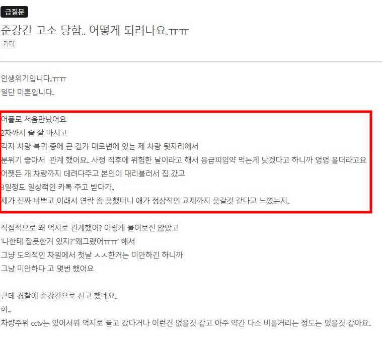 A 씨는 앱에서 만난 여성과 처음 만나 즐거운 데이트를 즐겼는데 두 사람은 2차까지 가서 함께 술을 마셨고, 이후 각자의 차량으로 돌아가 귀가하려고 했다고 전했다.