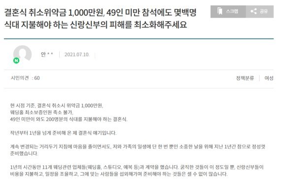 최근 청와대 국민청원 게시판에도 “예비 부부가 도대체 뭘 그렇게 잘못했냐”며 결혼식 거리두기를 완화해달라는 글이 올라왔다.
