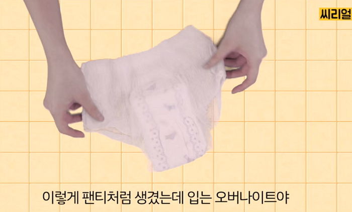 일반적인 방법으로 생리대를 하나 붙이고 엉덩이 부분에 생리대 하나를 더 붙여 T자 모양을 만들어준다.