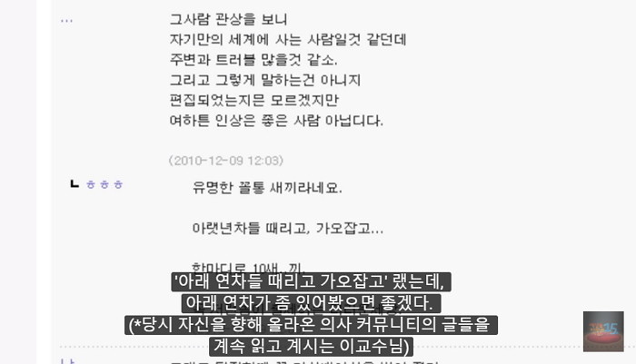 강의 중 이 교수가 공개한 의사 전용 온라인 커뮤니티에는 “(이 교수는) 유명한 꼴통 XX라네요”라며 “아랫년차들 때리고, 가오잡고… 한마디로 10XX”라는 내용의 글이 있어 충격을 안겼다.