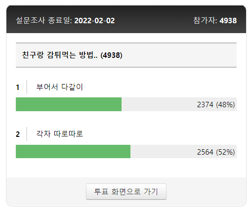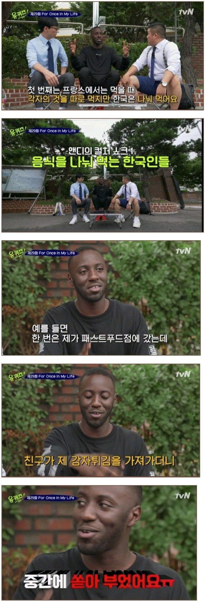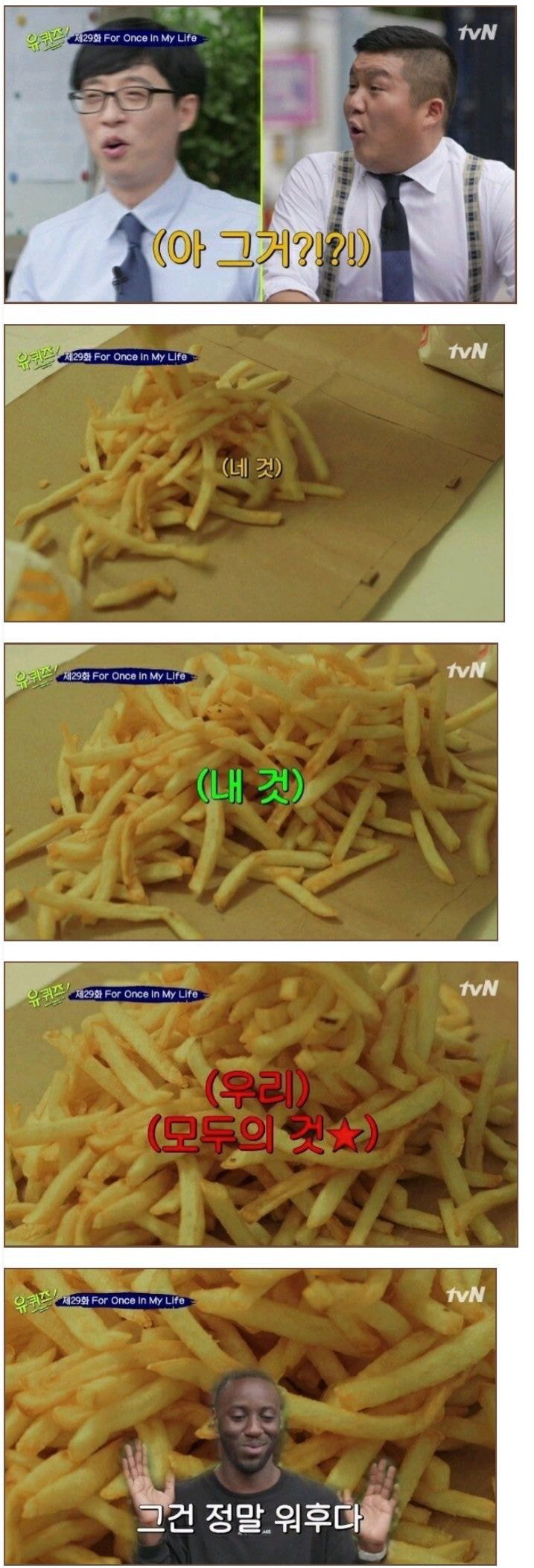 이어서 출연진은 “친구가 제 감자튀김을 가져가더니 중간에 모두 쏟아 부었습니다.”라고 말을 덧붙였다.