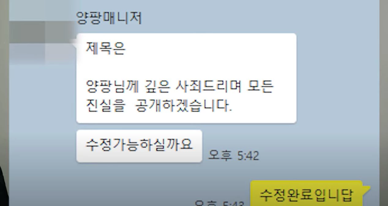 그는 “나도 예전에 양팡 사건 관련 합의서를 쓸 때 양팡 매니저로부터 내 유튜브 영상 표현에 관한 수정을 부탁받은 적이 있다”며 카카오톡 메시지를 증거로 내세웠다.