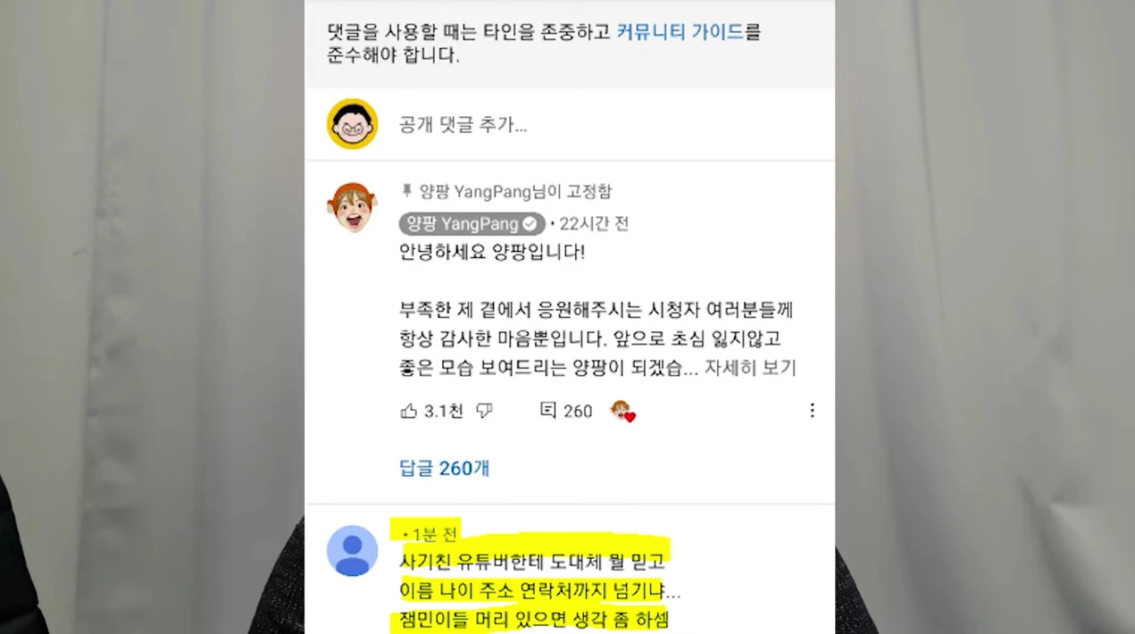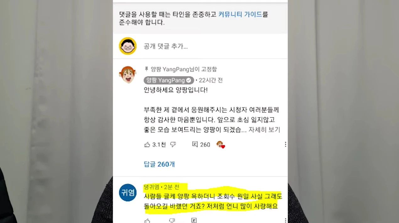 구제역은 양팡이 유튜브 댓글도 조종하고 있다며 그는 “양팡 채널 댓글 창에서 새로 고침을 누를 때마다 안 좋은 댓글은 사라지고 양퍙 편드는 댓글만 보인다”며 의혹을 제기했다.