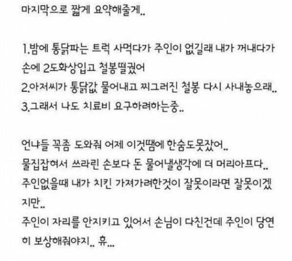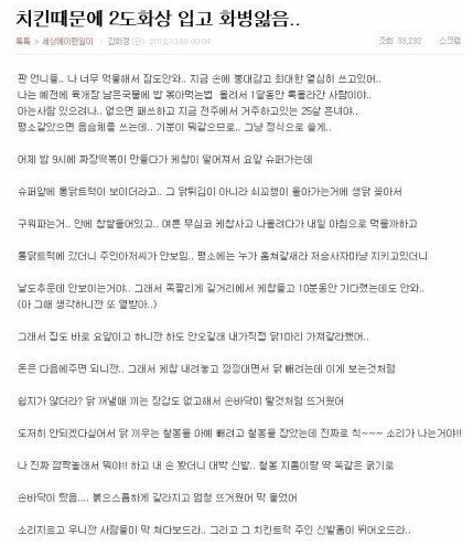 작성자 A씨는 “주인이 없어서 제가 ‘옛날통닭’ 꺼내다가 화상 입었는데, 치료비 청구 가능할까요?” 라는 제목의 글로 많은 이들의 이목을 집중시켰다.