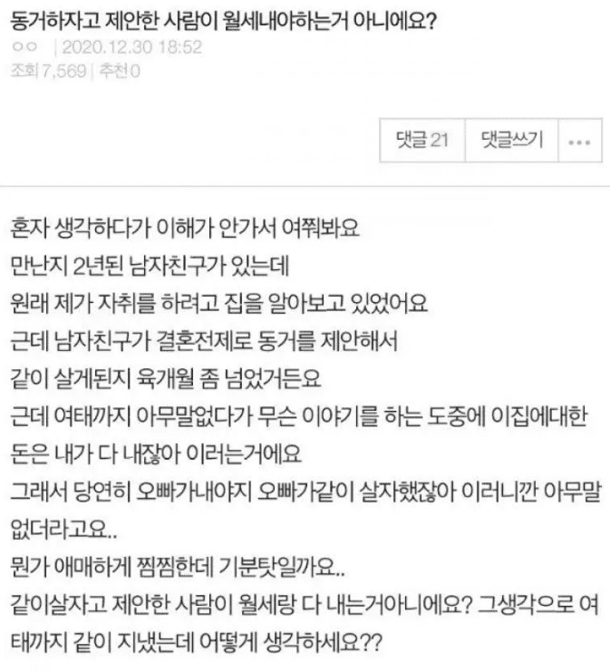남자친구와 동거를 하고 있는 한 여자의 사연이 전해졌는데 각종 온라인 커뮤니티에는 ‘같이 살자고 한 사람이 월세 내는거 아닌가요?’라는 제목의 게시물이 올라왔다.