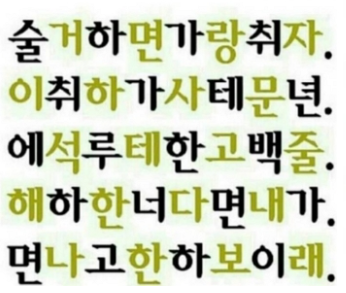또 검은색 텍스트만 같은 방식으로 읽으면 “술에 취하면 하루가 가고 너한테 취하면 백년 이 가.”라는 아주 눈쌀 찌푸려지는 문장이 있었다.