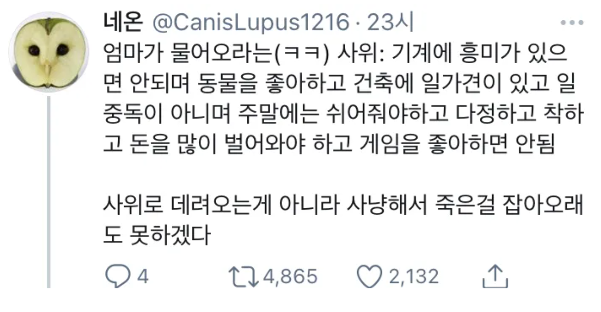 “또한 일중독이 아니고, 다정하며 착하고, 돈을 많이 벌어와야 한다고 저희 어머니가 말씀했습니다. 저는 이런 사위를 찾을 수 없을 것 같습니다. 여러분은 어떻게 생각하시나요?”라며 당시 상황을 전했다.