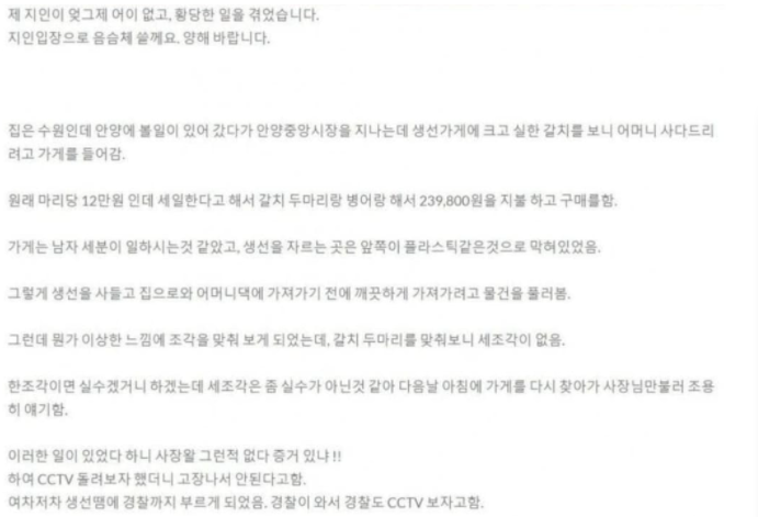 이어 “원래 마리당 12만 원인데 세일한다고 해서 갈치 두 마리랑 병어랑 해서 239,800원을 지불하고 구매했다. 가게는 남자 세 분이 일하시는 것 같았고 생선을 자르는 곳은 앞 쪽이 플라스틱 같은 것으로 막혀 있었다”고 설명했다.