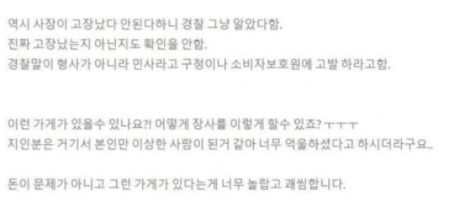 또 “여차저차해서 경찰까지 왔는데 사장이 CCTV 고장났다고 하니 경찰도 그냥 알았다고 하고 검사도 안 하더라. 경찰 말이, 형사가 아니라 민사라고 구청이나 소비자보호원에 고발하라고 하더라”라억울함을 전했다.