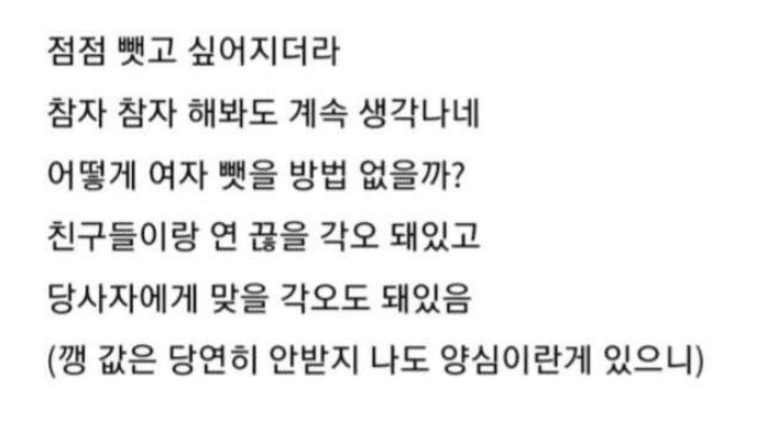이에 A씨는 글을 올리며 “어떻게 여자 뺏을 방법 없냐”,”친구들이랑 연 끊을 각오도 되어있다”며 터무니 없는 조언을 구했고 “당사자 B에게 맞을 각오도 되어있다”며”깽값은 나도 양심이라는 게 있으니 받지 않겠다”고 덧붙였다.