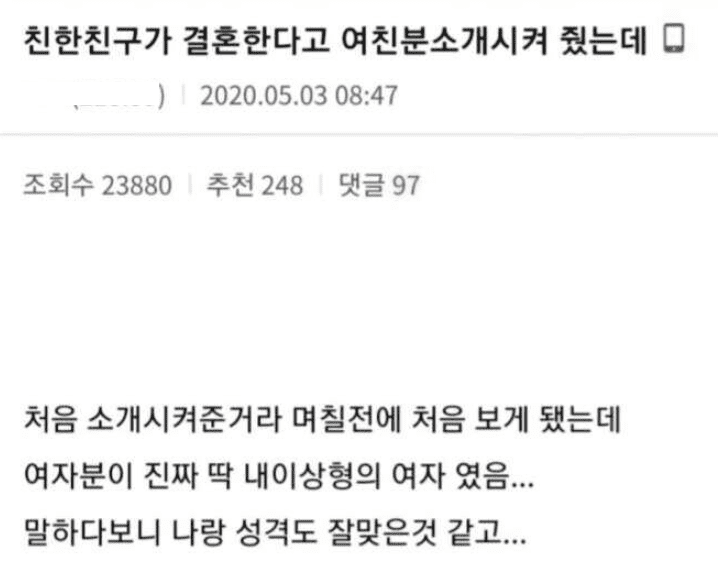과거 올라왔던 “친한친구가 결혼한다고 여친분 소개시켜 줬는데”라는 제목의 글이 재조명됐다.