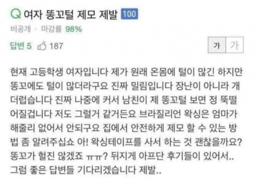 한 온라인 커뮤니티에 화제가 됐던 고등학생 여자라고 밝힌 여성이 네이버 지신in에 ‘여자 똥꼬털 제모 제발’ 이라는 제목의 글이 작성되어 네티즌들에게 화제가 됐다.