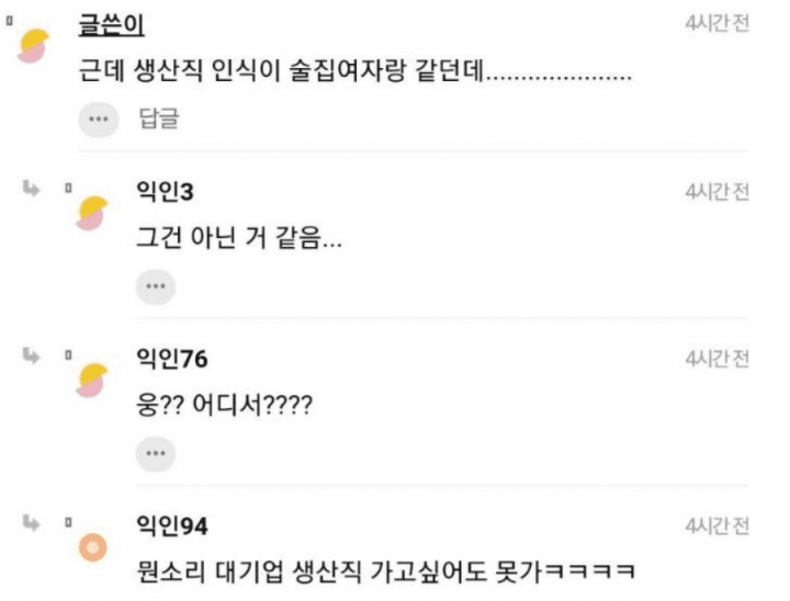 그러자 말도 안된다는 것을 느낀 누리꾼들은 “그건 아닌 거 같음”, “대체 어디서?”, “대기업 생산직 가고 싶어도 못가”등의 댓글을 남겼다.