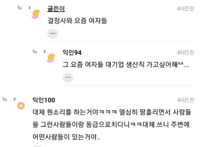 해당 여성은 대기업 생산직을 다니는 사람이나 술집여자나 다를 것이 없다는 주장을 한 것이다.