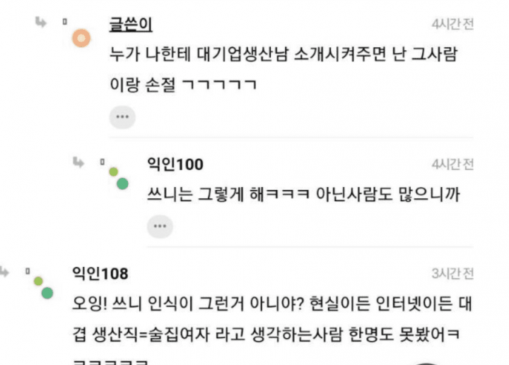 이렇게 비난을 받는데도 망언을 한 글쓴이는 누가 나한테 대기업 생산남 소개시켜주면 난 그 사람이랑 손절할거다”라고 받아쳤다.