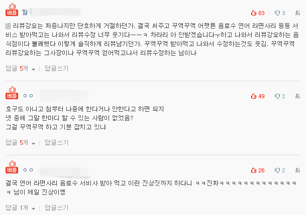 이에 네티즌들은 ” 서비스 다 받을 거 다 받아 쳐먹었네 ㅋㅋ그래놓고 리뷰수정?” “사장이 너무했네 돈내고 먹은 손님들한테 무례하다;;;” “요즘에 리뷰에 목숨을 거는구나” 등 다양한 반응을 보였다.
