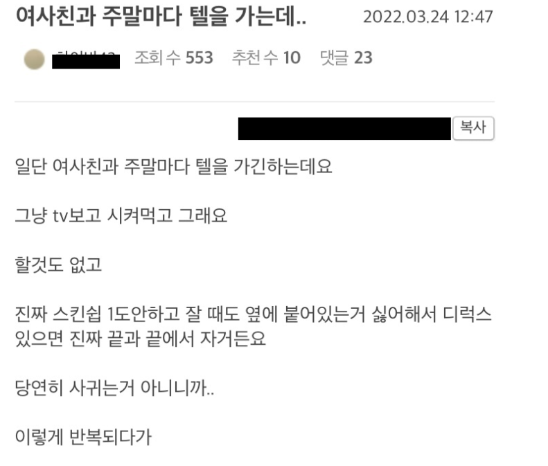 최근 한 온라인 커뮤니티에 글을 게시한 남성 A 씨는 자신의 여사친과 매주 주말마다 모텔에 간다고 사연을 써내려 갔다.