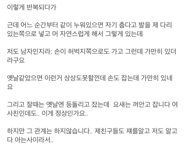 A 씨는 “근데 어느 순간부터 같이 누워있으면 자기 춥다고 발을 제 다리 있는 쪽으로 자연스럽게 올린다”면서 “저도 남자라 손이 허벅지 쪽으로도 가고 그러면 가만히 있더라. 옛날 같으면 이런 것은 상상도 못하는데 손도 잡아도 가만히 있는다”고 사건에 대한 전말을 전했다.