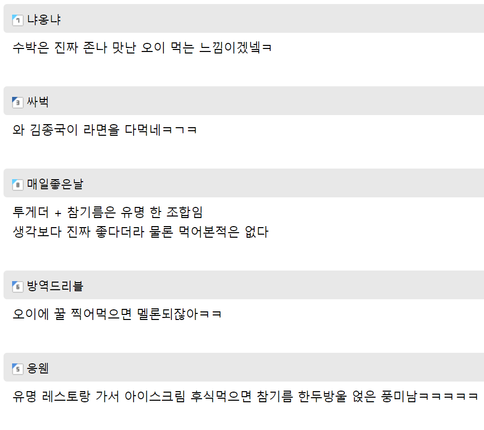 이를 본 온라인 커뮤니티 네티즌들은 “이 방송에 나온 음식 조합을 모두 먹어 봤는데요. 웬만하면 그냥 따로 먹는 게 좋은 것 같습니다.”라는 반응을 보였다.