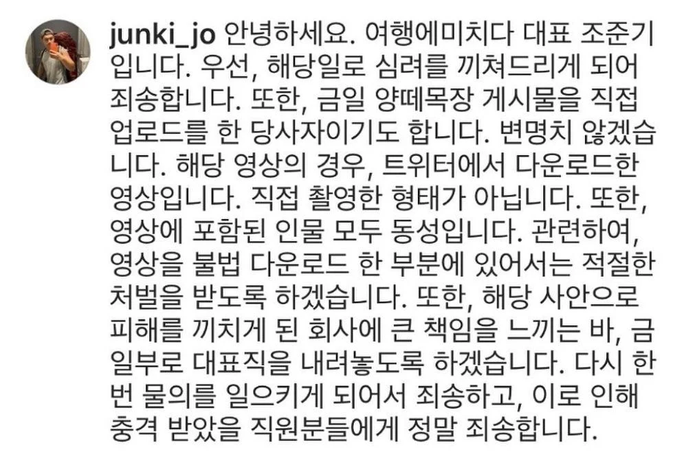 이에 해당 대표는 사과문을 올렸지만 곧바로 다시 내렸고 후에 다시 한번 장문의 사과문을 올렸다.