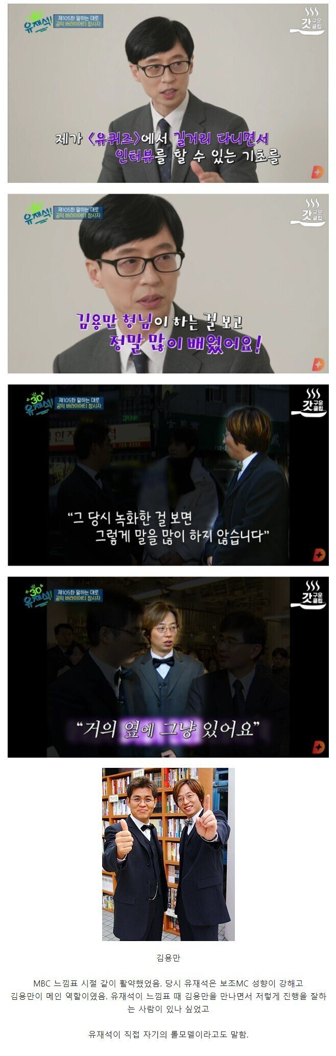 개그맨이자 국내 최고의 MC인 유재석은 방송 프로그램 유 퀴즈에 출연해 “제가 유 퀴즈에서 길거리 다니면서 인터뷰를 할 수 있는 기초를 김용만 형님이 하는 걸 보고 정말 많이 배웠습니다.”라며 당시 상황을 전했다.