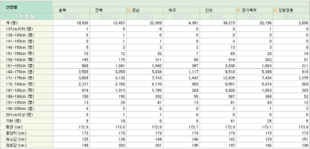 그리고 가장 많은 비율을 차지한 키는 171~175cm 사이이며 전체의 약 33%(9만 4,967명)이 해당 범위에 속했다.