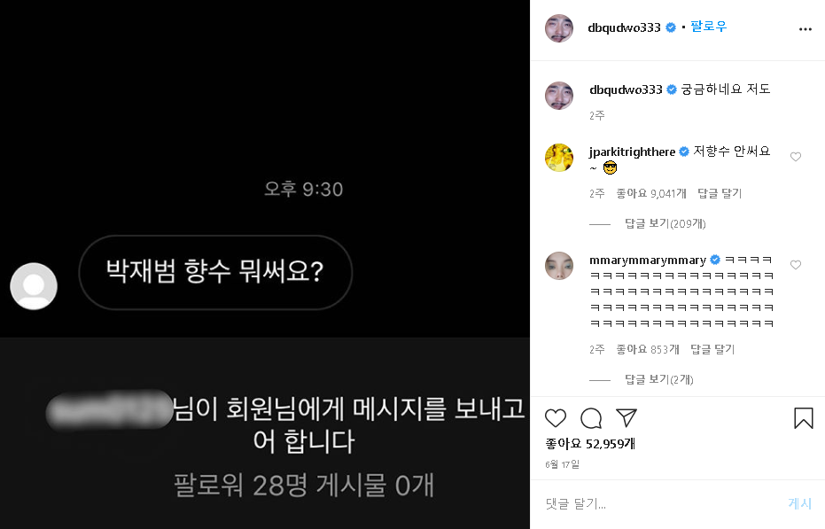 이에 유병재는 “궁금하네요 저도”라며 글을 올렸고, 박재범이 등판해 “저 향수 안써요~”라는 답을 남겼다.