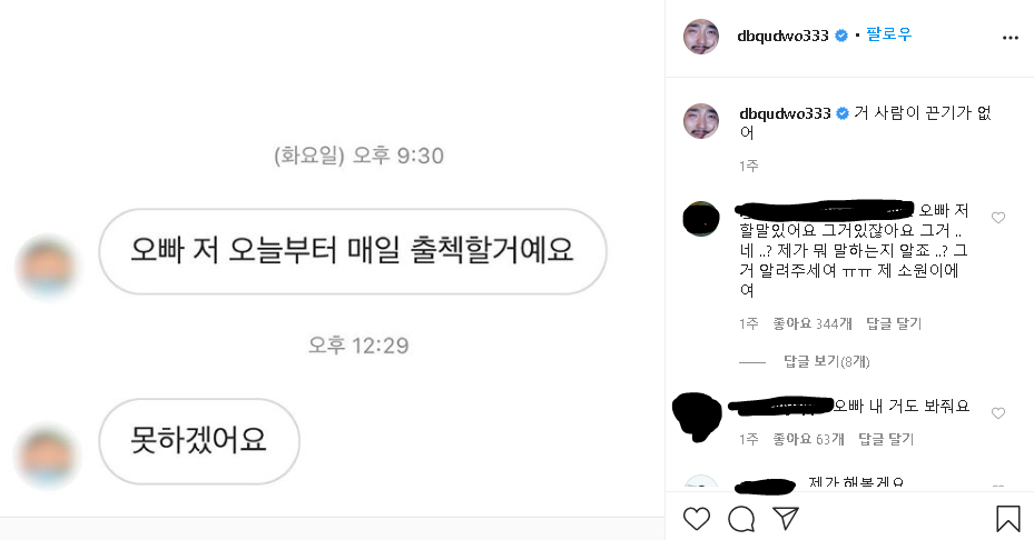 또 다른 네티즌은 “저 오늘부터 매일 출첵할거예요”라고 하다가 다음날 바로 “못하겠어요”라고 하자 유병재는 “거 사람이 끈기가 없어”라고 했다.