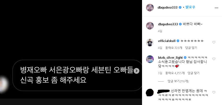 뿐만 아니라 임영웅도 등판해 댓글에 “병재님! 혹시 찬원이 자는지 물어봐줄 수 있나요?”라고 글을 남겼다.