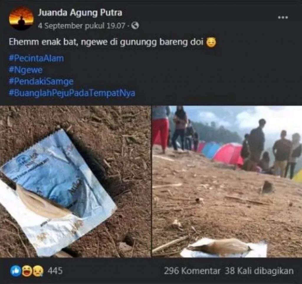 실제로 한 인도네시아 누리꾼은 자신의 SNS를 통해 “산에서 발견했다”며 콘돔 포장지 안에 사용된 콘돔이 담겨 있는 사진을 올리기도 했다.