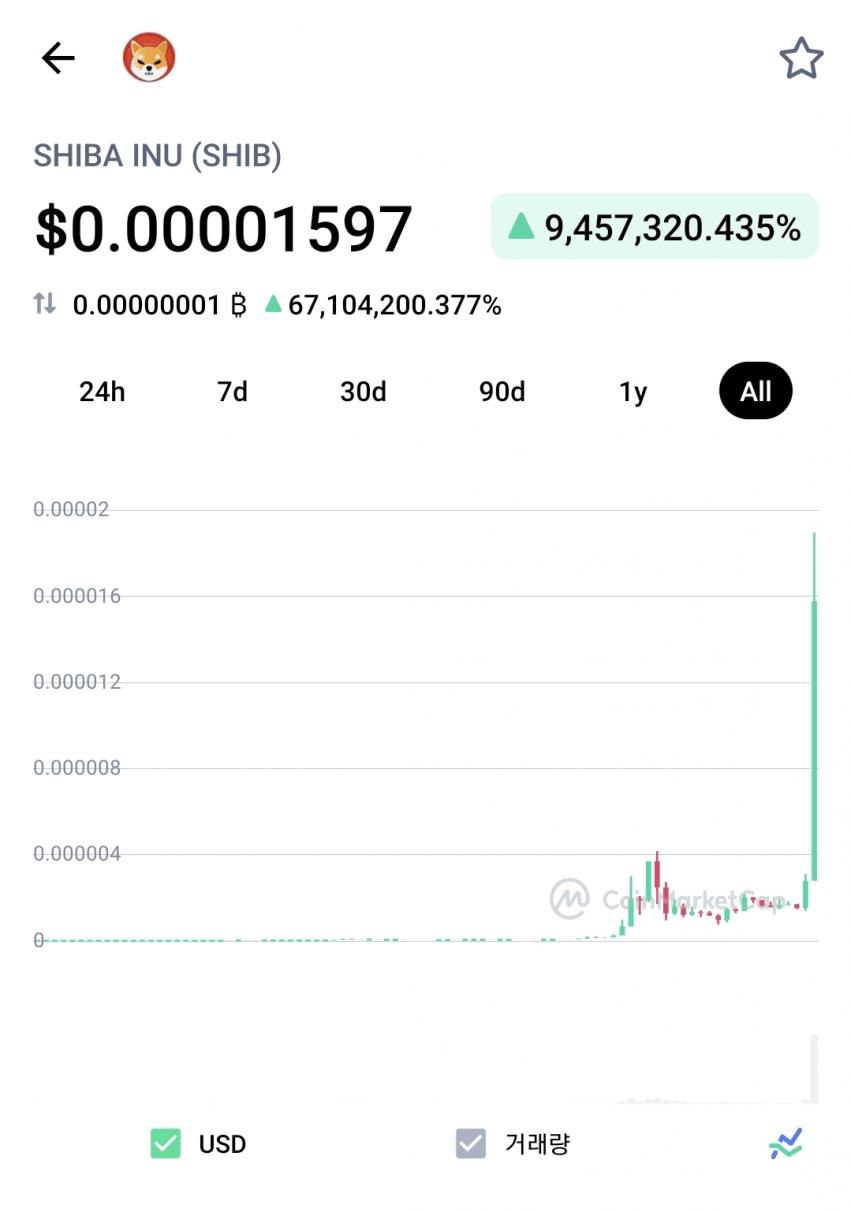 시바이누는 48시간 만에 0.000003달러에서 0.000032달러로 966%, 올해 들어 무려 230만% 가격이 올랐다.